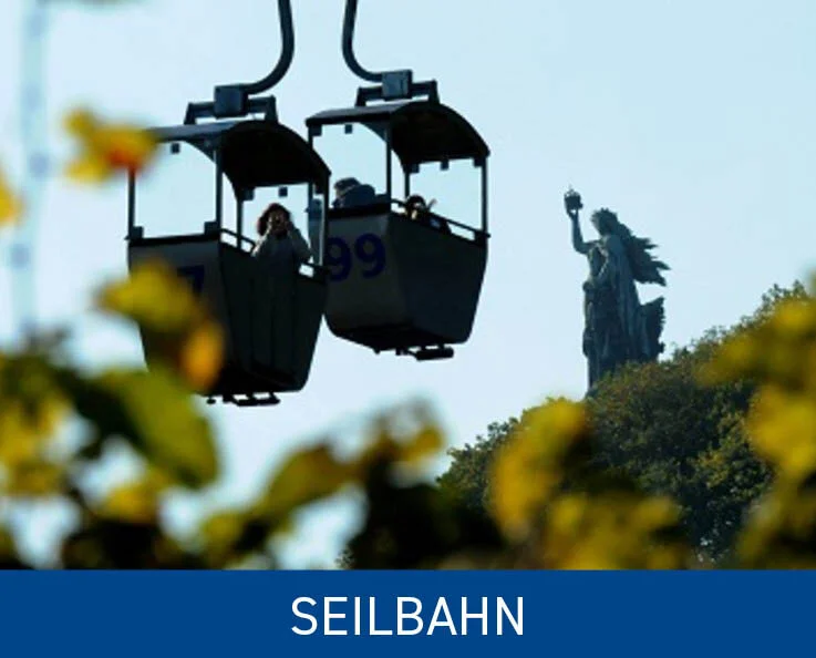 Genießen sie die aussicht bei einer fahrt mit der rüdesheimer seilbahn hinweg über die weinberge zum niederwalddenkmal.