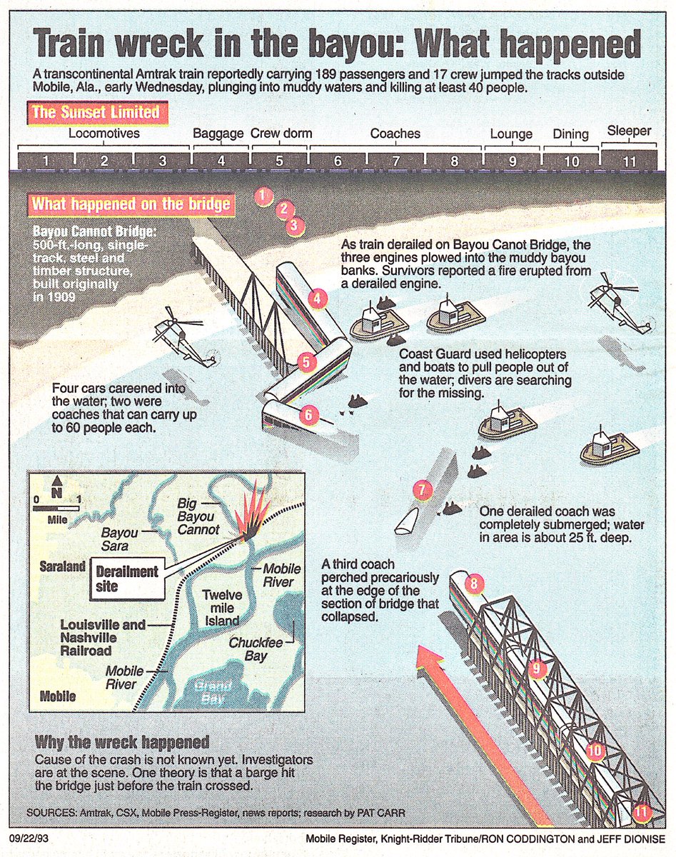 Tugboat pilot haunted by rail crash that killed 47. On september 22, 1993, one of the deadliest accidents in u.s. '93 amtrak crash in alabama survivor relives each new one. This deadly accident was the big bayou canot train wreck, which, to date, is the deadliest train wreck in amtrak's history. In nearby bessemer, alabama, amtrak spokeswoman kimberly woods said in a statement. In the dark of night, three travelers advanced inexorably toward tragedy. Amtrak has operated most intercity passenger rail transportation in the united states since may 1, 1971. An amtrak train headed to miami derails near mobile, alabama, killing 47 people on september 22, 1993.the accident, the deadliest in amtrak's history, was caused by a negligent towboat operator. Coast guardaerial and boat views of amtrak train derailment, mobile, alabamaava21271vnb1the videotape contains aerial views of the amtrak train derailme. 22, 1993, after a barge crashed into the bridge just as the train was crossing it. The crash happened around 11:30am. None of the 124 passengers onboard reported injuries, she said. Routinely investigated such accidents under federal train wreck statutes, which make it a federal crime to sabotage or damage a train in interstate commerce.